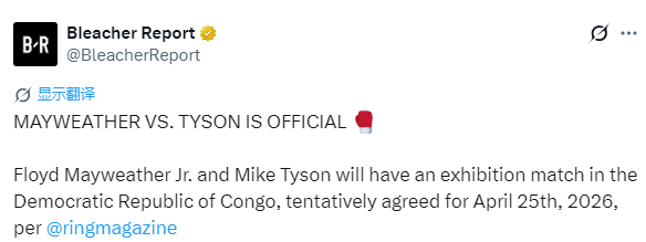 2026-02-17 08:20北京时间2月17日,据《拳台》杂志记者Mike Coppinger报道,迈克-泰森与梅威瑟初步定于2026年4月在刚果进行一场表演赛,该结果不计入两人职业战绩。