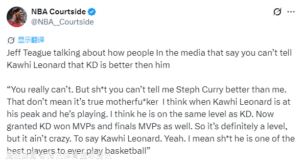 蒂格表示:“你确实不能这么跟他说。但你也别跟我说库里比我强,这不代表那就是真的。我觉得莱昂纳德处于巅峰,正常打球的时候,和杜兰特是同一档的。诚然,杜兰特拿过MVP、总决赛MVP,所以确实有差距,但没那么夸张。”