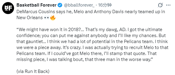 考辛斯说道:“我们2018年本来可能夺冠的……那是我的兄弟浓眉。我信心十足,你让我对上谁我都觉得自己有机会。但那轮系列赛太难了……我觉得那支鹈鹕潜力巨大,我们就差一块拼图。真的很疯狂。我当时真的在努力招募安东尼来鹈鹕。如果能把安东尼招来,我敢这么说——我所说的那块缺失的拼图,就是我们极度需要的第三巨头。”