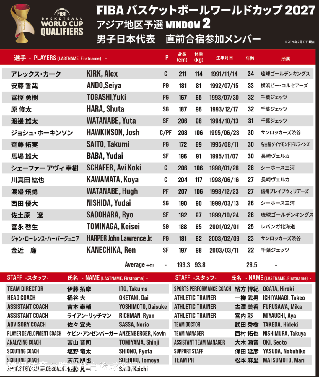 日本男篮此前的集训名单球员包括渡边雄太、富坚勇树、马场雄大、富永启生、归化内线霍金森、柯克等人。
