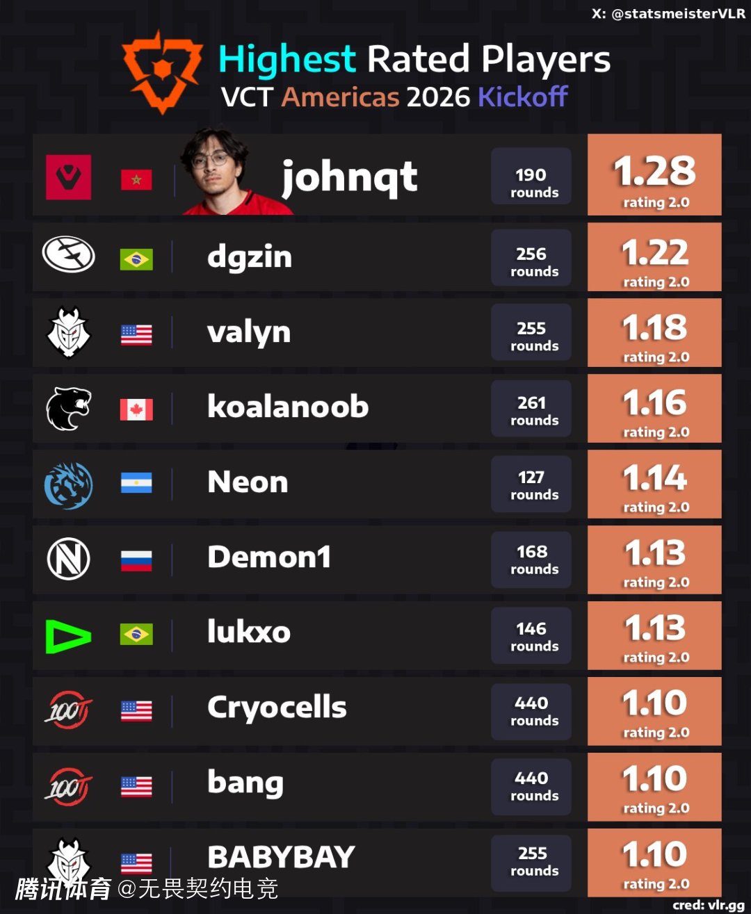 2026-02-17 19:302月17日,外媒统计美洲赛区2026启点赛rating排行: