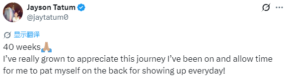 塔图姆发文写道:“40周了。我真的越来越感恩这段经历,也终于舍得给自己一点时间,为自己每天都坚持到场、认真付出而自豪。”