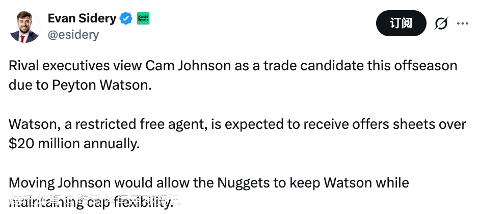 作为受限制自由球员,沃森预计会收到年薪超过2000万美元的报价合同。交易掉约翰逊,将让掘金队既能留住沃森,又能保持薪资空间的灵活性。