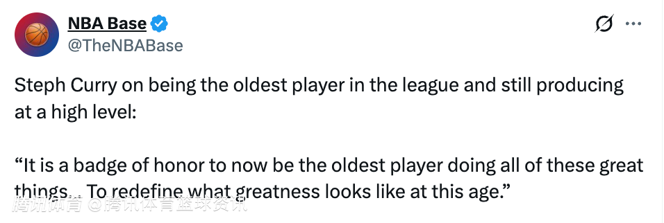 谈到自己成为联盟最年长球员之一,却仍能保持高水平表现时,库里表示:“现在能以最年长球员之一的身份完成这些伟大的事,这是一种荣誉勋章,我要重新定义这个年纪的伟大是什么样的。”