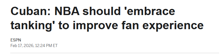 2026-02-18 05:50北京时间2月18日,马克-库班公开支持NBA摆烂。这位前独行侠老板表示,NBA应该“拥抱摆烂”,首要原因就是球迷观赛体验。