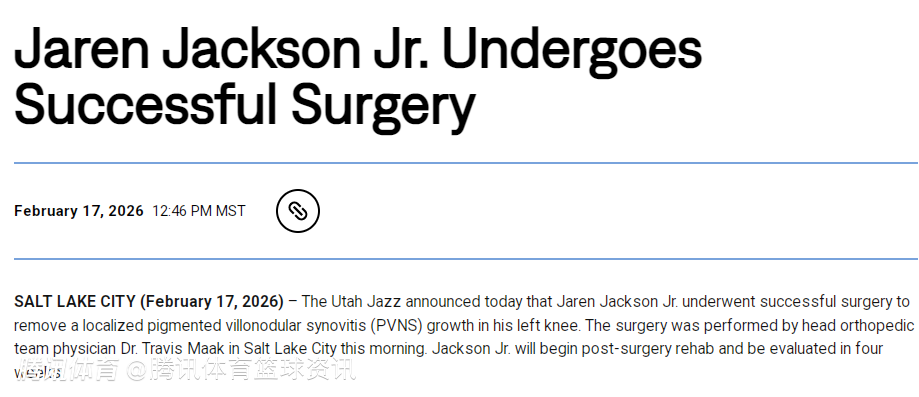 2026-02-18 06:30北京时间2月18日,爵士队今日在官方声明中确认,小贾伦-杰克逊已成功接受手术,移除了左膝内一处局限性色素沉着绒毛结节性滑膜炎(PVNS)增生组织。