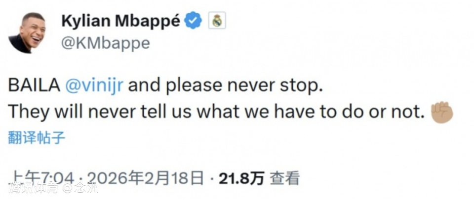 接着,姆巴佩又发文道:“跳舞吧,维尼修斯,永远不要停下来。他们永远无法告诉我们该做什么或不该做什么。”