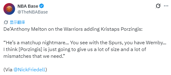 梅尔顿表示:“和波尔津吉斯对位是场噩梦,就像马刺拥有文班亚马那样。我认为波尔津吉斯会给我们带来足够的高度,以及我们需要的大量错位优势。”