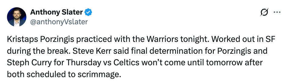 2026-02-18 11:50北京时间2月18日,据勇士队记Anthony Slater报道,球队新援波尔津吉斯今天与勇士队一同进行了合练,在全明星休赛期期间,他也一直在旧金山进行个人训练。