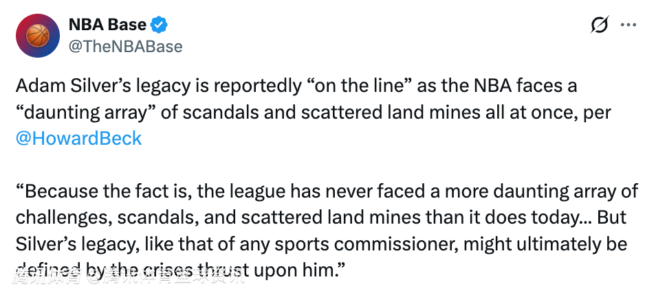 2026-02-19 01:00北京时间2月19日,据美记霍华德-贝克报道,随着NBA同时面临“一系列令人望而生畏的丑闻和潜在雷区”,萧华的声誉正“岌岌可危”。