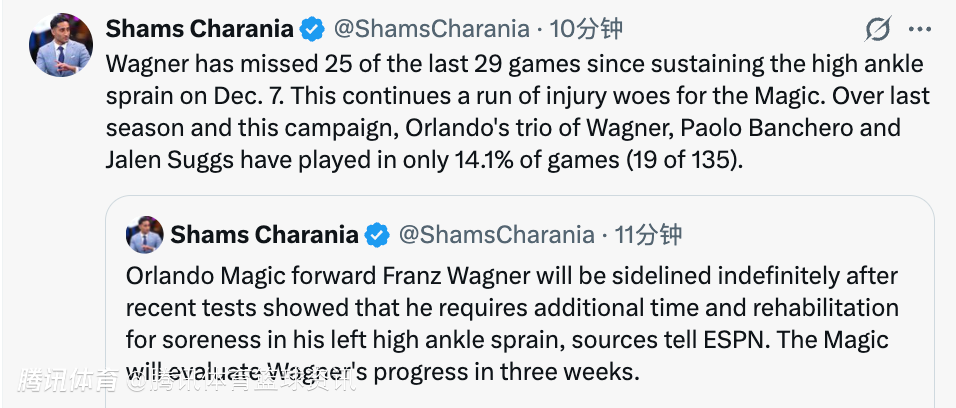 自12月7日遭遇高位踝关节扭伤以来,小瓦格纳在过去29场比赛中缺席了25场。这让魔术队的伤病困扰雪上加霜。在上赛季和本赛季中,魔术的核心三人组小瓦格纳、班凯罗和萨格斯共同出战的比赛仅占14.1%(135场中仅合计出战19场)。