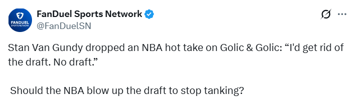 2026-02-19 06:00北京时间2月19日,NBA显然对球队为了选秀而摆烂的行为感到不满,而斯坦-范甘迪(大范甘迪)认为,解决问题的办法就是直接取消选秀。