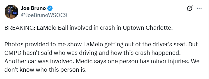 2026-02-19 06:40北京时间2月19日,据记者Joe Bruno报道,黄蜂球星拉梅洛-鲍尔在夏洛特市中心发生车祸。 目击者称,鲍尔从一辆悍马车里出来,坐进了一辆兰博基尼,看上去并无大碍。医疗报告显示,一人受了轻伤。