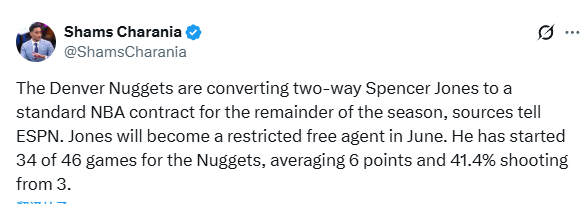 2026-02-19 07:10北京时间2月19日,根据名记Shams的报道,消息人士向ESPN透露,丹佛掘金将把双向球员斯宾塞-琼斯的合同转为标准NBA合同,合同延续至本赛季结束。