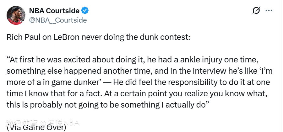 经纪人富保罗:詹姆斯没有义务参加扣篮大赛 赢了人们也会说暗箱操作