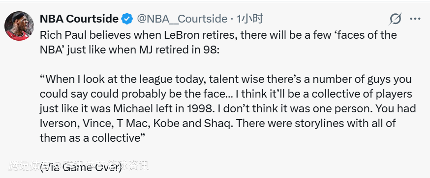 里奇-保罗认为,当詹姆斯退役后,NBA将会出现多位“门面球星”,就像1998年乔丹退役时一样:“在我看来,如今联盟有天赋的球员很多,不少人都能成为联盟门面。我认为会是一群球员共同撑起联盟,就像1998年乔丹离开后那样。当时并非只有一人,而是艾弗森、卡特、麦迪、科比和奥尼尔,他们共同成为了联盟的故事主角。”