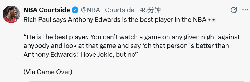 里奇-保罗还表示,爱德华兹是当今NBA最佳球员。“他就是最佳球员。无论对手是谁,你看完任何一场比赛,都不能说‘那个人比爱德华兹更强’。我很喜欢约基奇,但答案是否定的。”