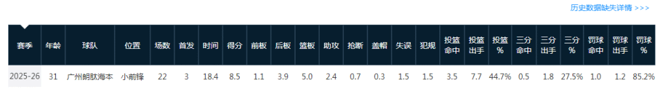 在本赛季效力广州男篮第一阶段的前23场比赛,托马斯出场22场比赛,其中3场首发,场均18.4分钟得到8.5分5篮板2.4助攻0.7抢断与0.3盖帽,托马斯只有两场比赛得分20+。
