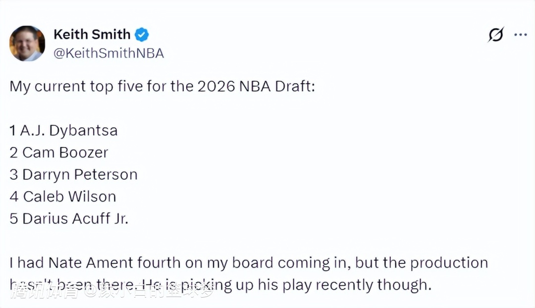 根据NBA记者肯尼-史密斯的排名,2026年状元就是AJ-迪班萨,第二是卡梅隆-布泽尔,第三是帕特森,第四是沃尔森、第五是阿卡夫。