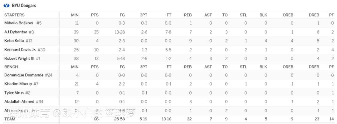 杨百翰大学最大的问题就是阵容硬实力不济,AJ-迪班萨选择这支球队的关键因素可能就是有足够多的球权,此役他39分钟,28中13,三分6中2,罚球8中7,拿到35分7篮板2助攻,命中率46.4%,三分命中率33.3%。
