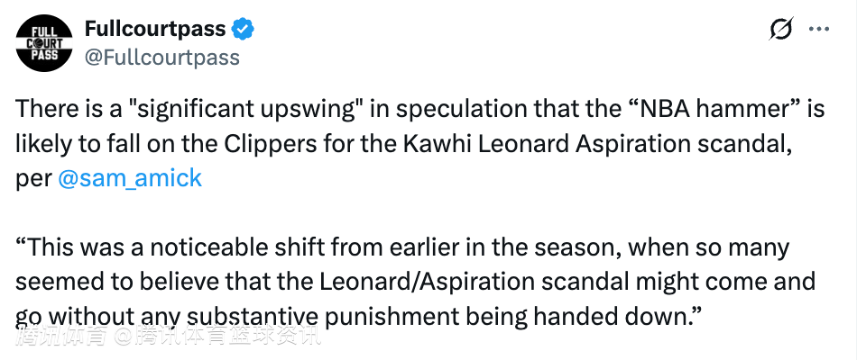 2026-02-20 01:10北京时间2月20日,据美记Sam Amick报道,外界普遍猜测,针对小卡与Aspiration公司的违规招募丑闻,NBA很可能会对快船队祭出“重锤”,相关猜测的热度正显著上升。