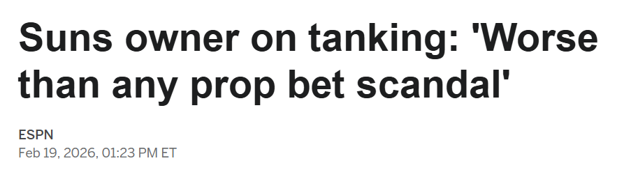 2026-02-20 05:10北京时间2月20日,菲尼克斯太阳队老板马特・伊什比亚强烈抨击NBA的摆烂现象,称其是“失败者做出的输球行为”,并且“比任何投注丑闻都要恶劣得多”。