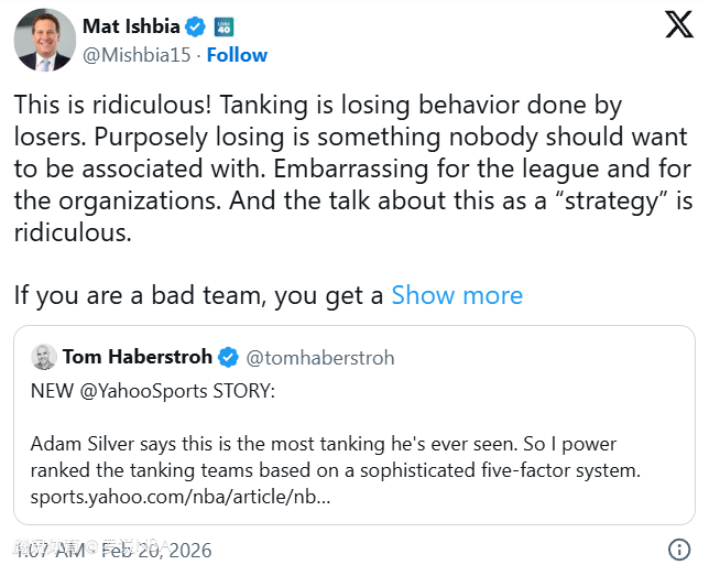 “这太荒谬了!摆烂就是失败者做出的输球行为,”伊什比亚写道。“故意输球是任何人都不该沾边的事。这对联盟、对这些球队来说都是耻辱。把这当成一种‘策略’来讨论,更是荒唐。”