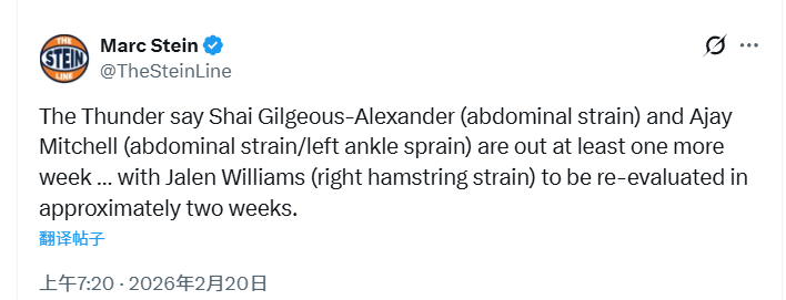 2026-02-20 07:40北京时间2月20日,雷霆官方发布公告,更新球队最新伤情。其中,亚历山大(腹部拉伤)与后卫阿贾伊-米切尔(腹部拉伤/左脚踝扭伤)均将在大约一周后接受伤情复查。杰伦-威廉姆斯(右腿筋拉伤)将在大约两周后评估。