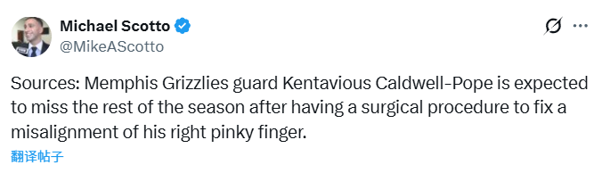 2026-02-20 07:50北京时间2月20日,据记者Michael scotto报道,有消息人士透露,孟菲斯灰熊后卫波普因接受右手小指错位矫正手术,预计将缺席本赛季剩余所有比赛。