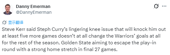 科尔表示,库里因膝盖持续酸痛至少还要再缺阵5场比赛,但这丝毫不会改变勇士本赛季剩余赛程的目标。勇士希望在最后27场比赛中凭借强势表现,直接避开附加赛。“这只是持续性酸痛。我们原本显然希望库里经过全明星休息后,今晚能够出战,但情况并非如此。他还需要更多时间恢复。”