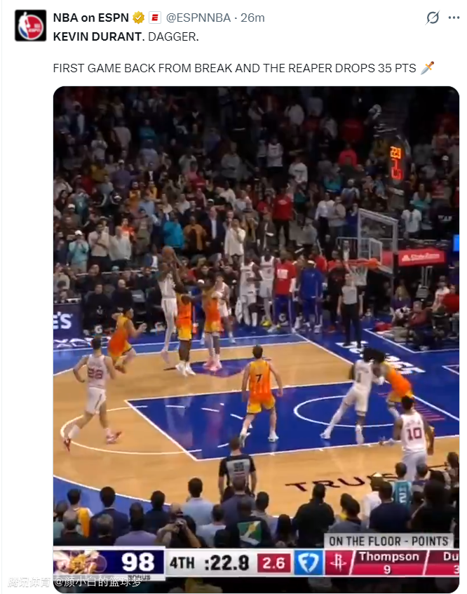 就连NBA官方都说杜兰特此役就如同利刃出鞘一般斩获35分。