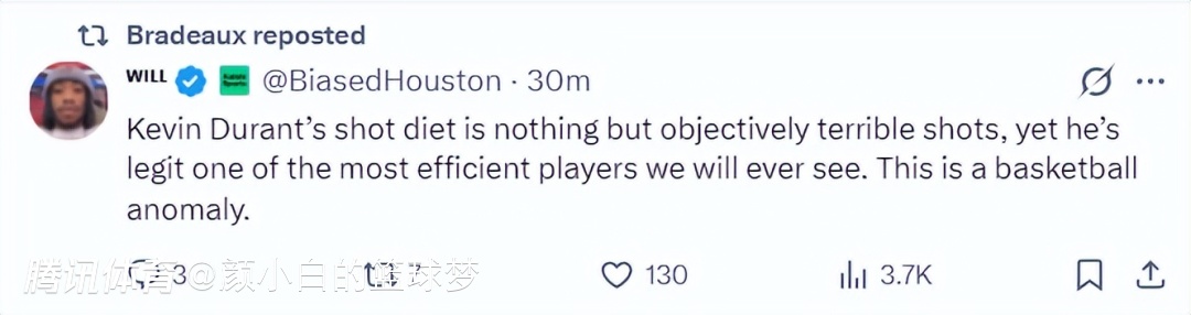 休媒Will:杜兰特的投篮其实就是最纯粹的糟糕出手,然而他却是我见过历史最高效的球员之一,这在篮球界都是一个奇异的现象。