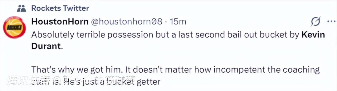 休媒:说实话我们打出了一场极其糟糕的比赛,但杜兰特在最后一刻一人扛起火箭为球队挽回颜面,这就是我们交易他的原因,无论教练组多么无能,他都能稳定输出。
