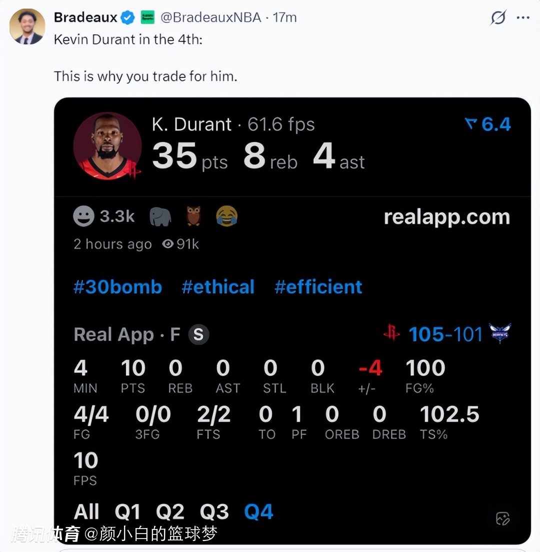 火箭队记兰德里-宾克利:这就是斯通换来KD的原因!一次次的精彩中距离,他拿到35分包括全场最关键的一个突破三人防守的急停,最后时刻接球造犯规两罚全中。对于杜兰特来说这是重大意义的胜利。