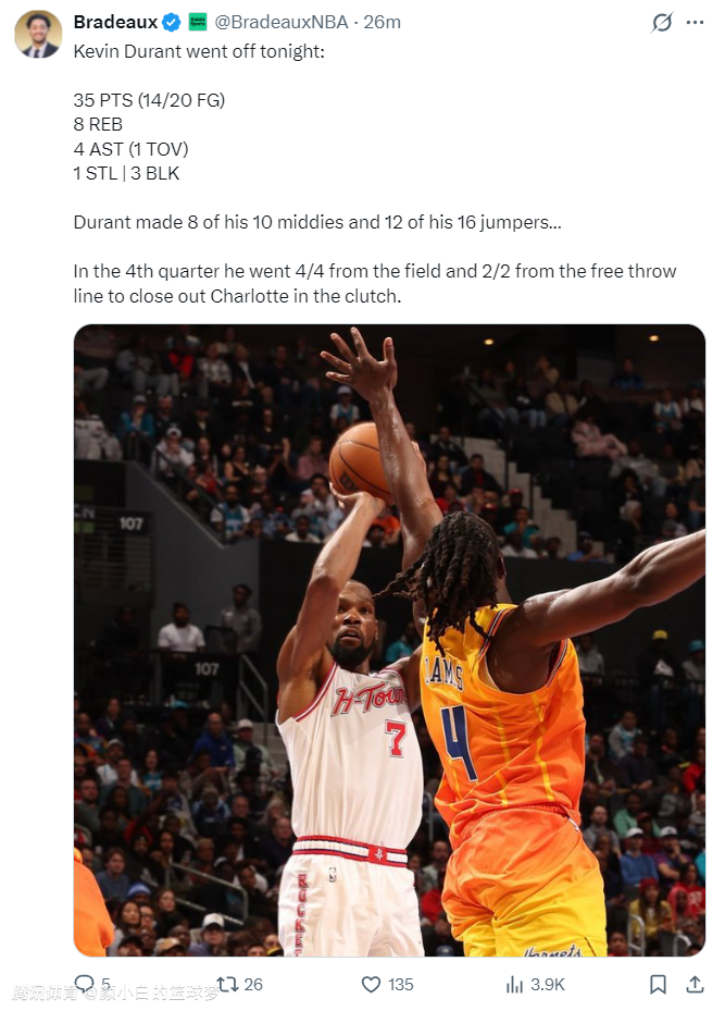 休媒:杜兰特中投10中8,全场跳投16中12,第四节更是4中4+罚球2中2,他在关键时刻帮助火箭击败黄蜂。