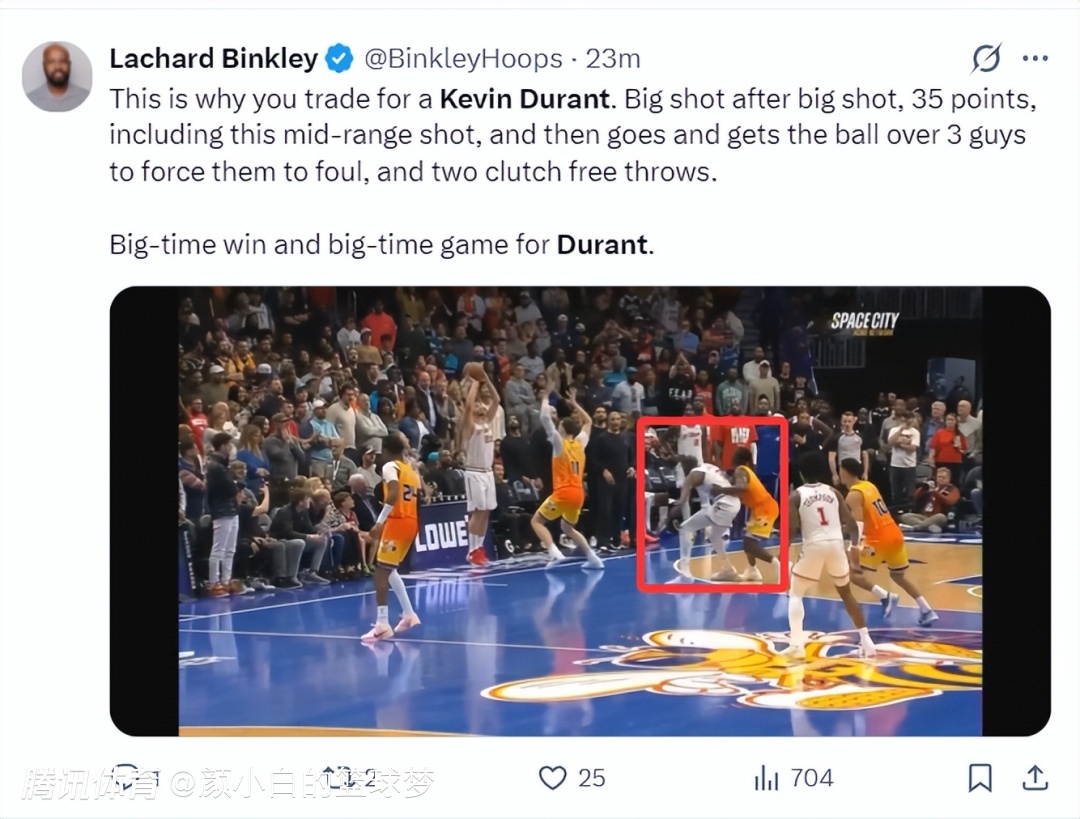 最关键的是杜兰特在决胜时刻(最后5分钟),4中4,罚球2中2,拿到10分,终场前3.2秒两个罚球准绝杀成功。休斯顿美媒纷纷为KD竖起大拇指。