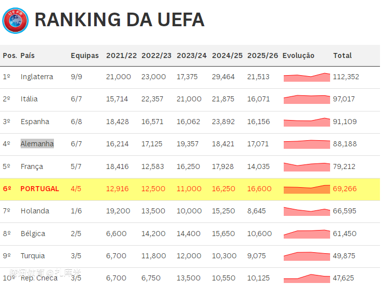 德国联赛以88.188分排名第4,法国则是以79.212分排名第5。葡超以69.266分排名第6,如果能维持目前的排名,葡超有望重新拿到3个欧冠席位,包括2个直接晋级名额,1个附加赛名额。