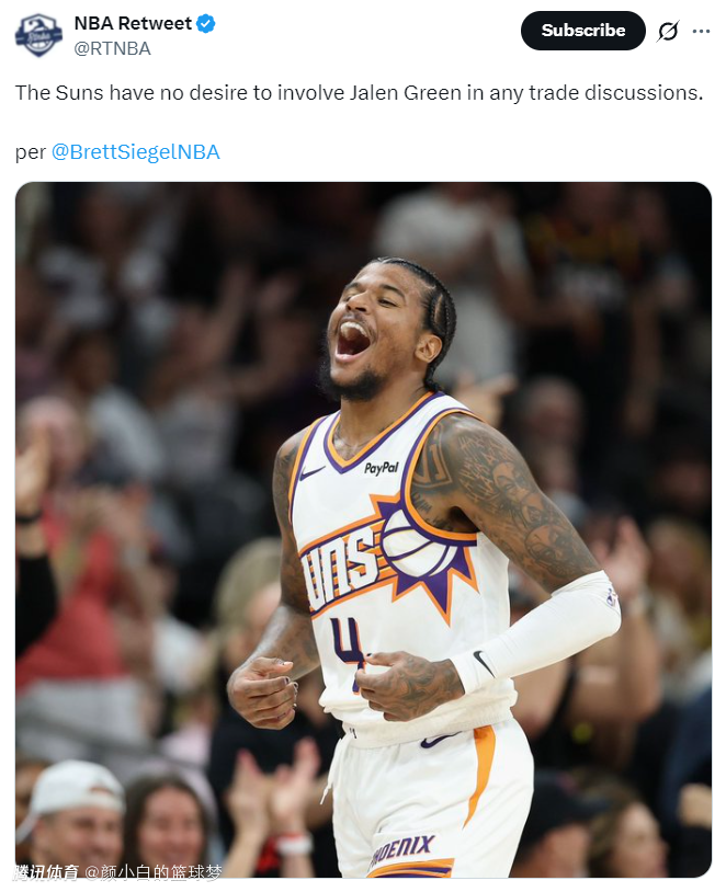 在交易截止日前,NBA记者Brett Siegel透露,太阳队无意在本赛季交易杰伦-格林。换言之格林是目前太阳队的非卖品之一,太阳管理层也公开发声相信布克、格林的后场组合是联盟最出色的后场组合之一,只可惜两人在本赛季遭遇了大面积的伤病。