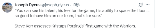 在谈到波尔津吉斯首秀的表现时,科尔说道:“我觉得他(波尔津吉斯)表现得不错。加盟一支新球队,只练了一次就上场比赛从来都不是件容易的事,而且在新球队的第一场比赛,总是会有点生疏。但我觉得从上半场到下半场,他明显打得更自在、更快融入了。他能拉开空间,阅读比赛,毫无疑问,他能加入我们球队真的很棒。”