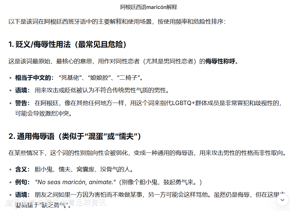 据《记录报》了解,普雷斯蒂安尼已接受欧足联质询。球员本人在光明球场向多名赛事相关人士保证,他并未称维尼修斯为“macaco(西语中的猴子)”,而是使用了“maricón”一词。他表示,该词并非出于恐同歧视的意义,而是在阿根廷常用语中用以称呼对手为“爱哭鬼”或“告状精”。