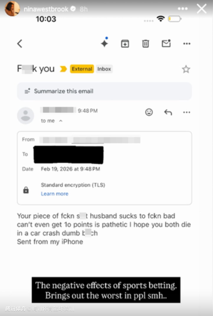 2026-02-20 23:50北京时间2月20日,据TMZ报道,威少的妻子妮娜收到了一封来自愤怒球迷的骇人邮件。这名球迷因不满威少在场上的表现,在邮件中辱骂她是蠢货,并诅咒他们一起死于车祸。