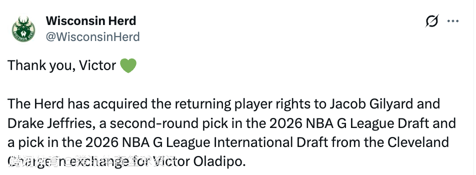 2026-02-21 01:40北京时间2月21日,据雄鹿G联盟附属球队威斯康辛鹿群队官方宣布,球队送出奥拉迪波,从克利夫兰冲锋队得到了雅各布-吉利亚德和德雷克-杰弗里斯的回归球员权、2026年G联盟选秀的一个次轮签,以及2026年G联盟国际选秀的一个签位。