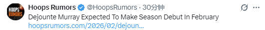 2026-02-21 08:50北京时间2月21日,NBA常规赛继续进行,鹈鹕队对阵雄鹿队。鹈鹕队临时主教练博雷戈透露,德章泰-穆雷将在未来一周内迎来赛季首秀。