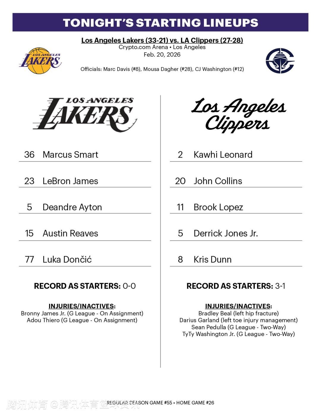 2026-02-21 10:50北京时间2月21日,NBA常规赛继续进行,湖人队对阵快船队。赛前,双方公布了本场比赛的首发名单。