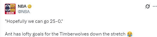 在谈到球队剩余25场比赛的目标时,爱德华兹调侃道:“希望我们能取得25胜0负的战绩,我们会为此全力以赴的。”