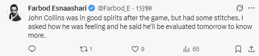 科林斯表示:“我感觉还好,只是左眉骨上方缝了几针。”多位快船队记者还透露,科林斯的精神状态看起来还不错,明天科林斯将接受进一步检查,之后才会有更多关于他伤情的消息。