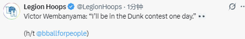 此役,文班亚马在比赛中完成了一次漂亮的双手风车扣篮,赛后在谈到此球时,文班亚马说道:“我是说,总有一天我会参加扣篮大赛的。”