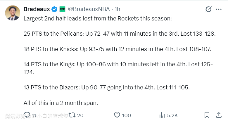 休媒晒出过去两个月内,火箭队已经有四次下半场领先至少13分的情况下被逆转了,最惨烈的一场是下半场领先鹈鹕25分却被逆转了。这场是领先尼克斯18分被逆转。