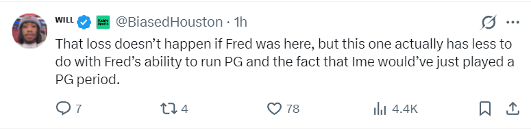 休媒:如果有范弗利特的话这场被逆转不会发生。但这场比赛的失利其实跟范弗利特的组织进攻能力没有太大关系。(暗示还是乌度卡的问题)