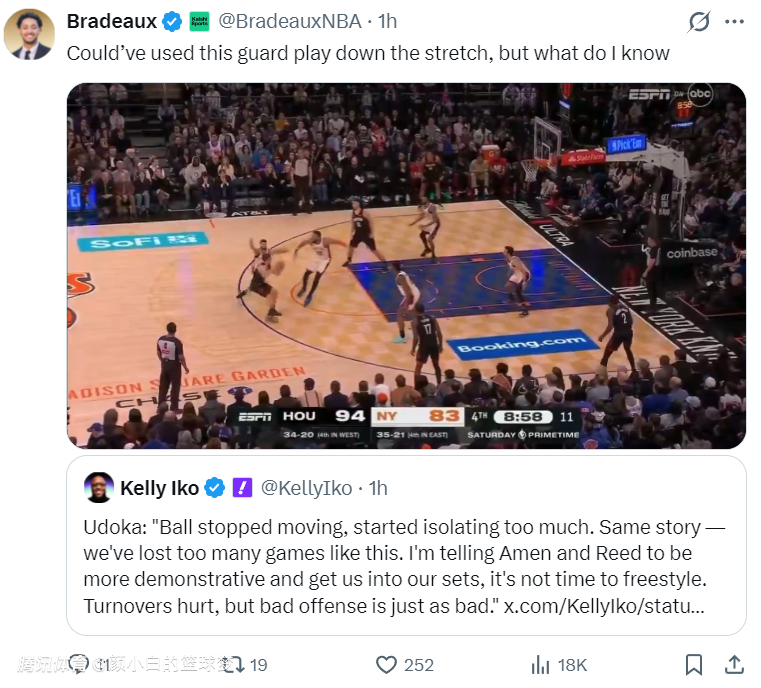 2026-02-22 15:40火箭2分惜败尼克斯,而这场比赛火箭一度领先尼克斯达到18分之多,可在末节火箭18中5,命中率仅为27.8%且出现了9次失误,他们帮助尼克斯打出33-15的攻防浪潮,尤其是最后5分钟关键时刻球队是接连出现低级的失误,这场比赛引发了全美热议。